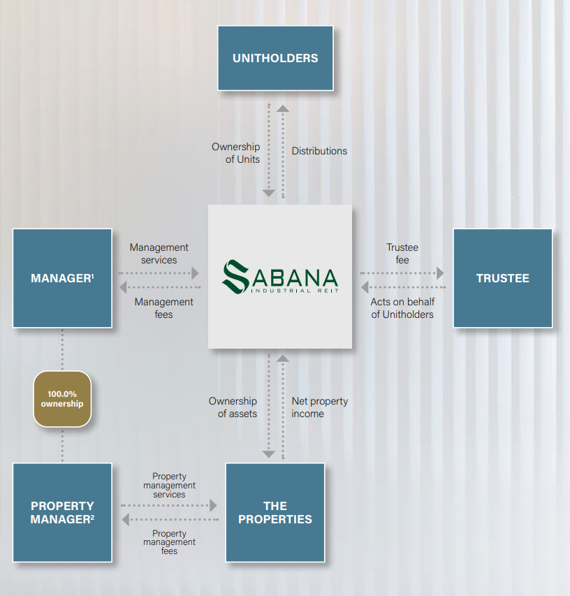 Sabana Industrial REIT has a diversified property portfolio valued at $915.9 million as at 31 December 2024, comprising 18 properties located across Singapore. The portfolio has a total gross floor area of approximately 4.2 million square feet. Sabana Industrial REIT has four main industrial property segments: High-tech Industrial, Chemical Warehouse and Logistics, Warehouse and Logistics and General Industrial. The REIT is managed by an external manager, Sabana Real Estate Investment Management Pte. Ltd. (the "Manager").